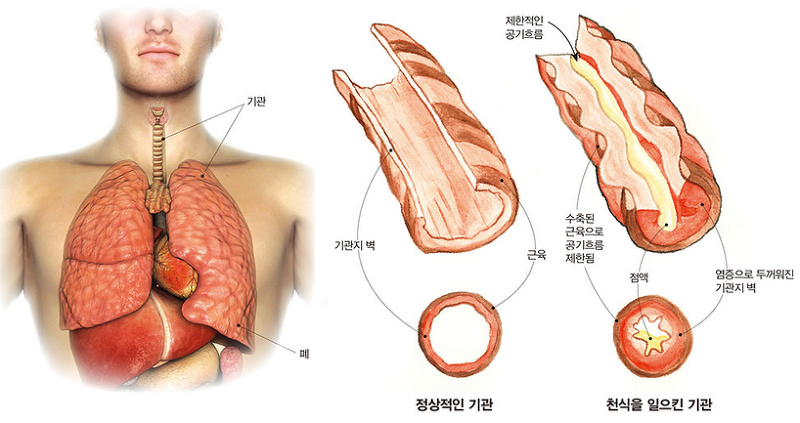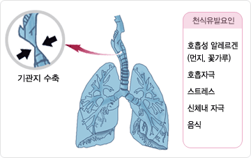 천식은 기도의 염증으로 인하여 호흡이 어려워지는 질환입니다. 호흡곤란, 기침, 쌕쌕거림 등의 증상이 나타나며, 이러한 증상은 주로 기도의 수축이나 염증 때문에 발생합니다.
